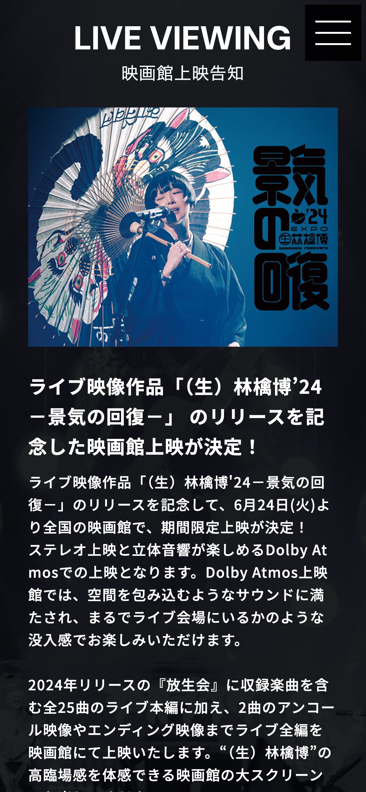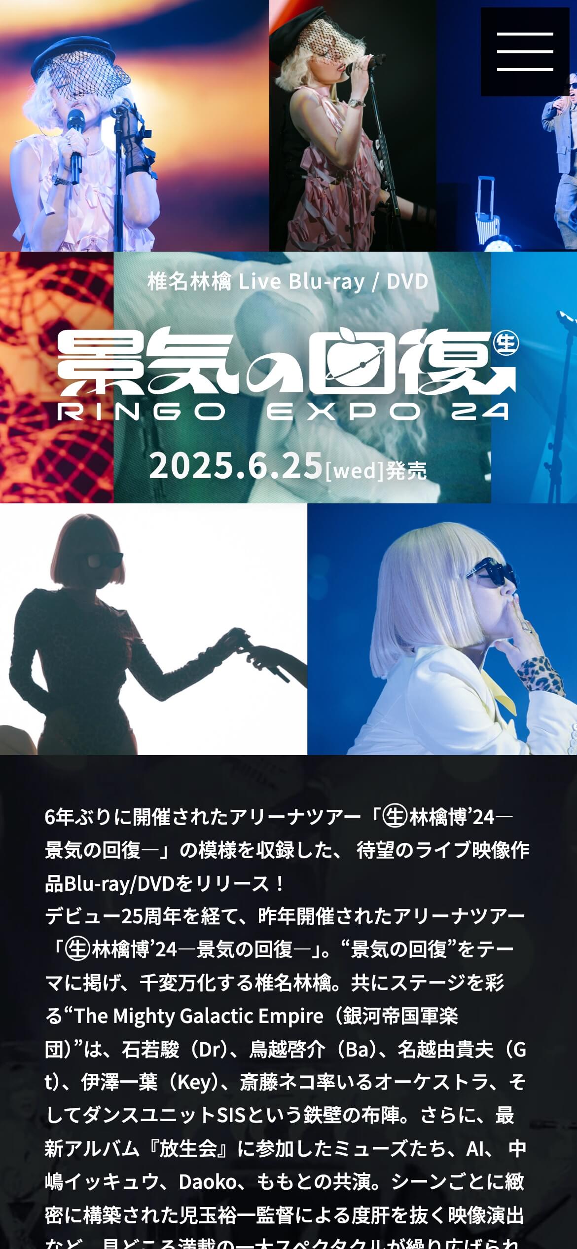 椎名林檎ライブ映像作品「(生)林檎博’24―景気の回復―」 OFFICIAL SITE 椎名林檎ライブ映像作品Blu-ray/DVD「(生)林檎博’24―景気の回復―」 URL https://sp.universal-music.co.jp/ringo/ringoexpo24/ LPCODINGDESIGN DESCRIPTION 椎名林檎ライブ映像作品Blu-ray/DVD「(生)林檎博’24―景気の回復―」2025年6月25日発売 BACK BACK TO INDEX NEXT お問い合わせCONTACT ファンクラブ、制作に関することならお気軽にご連絡ください。お見積もり依頼も可能です。 会社資料ダウンロードDOCUMENT 実績などをまとめた資料をPDFにてご用意しております。ご自由にダウンロードください。