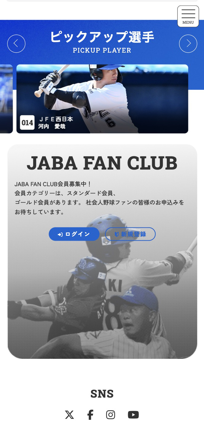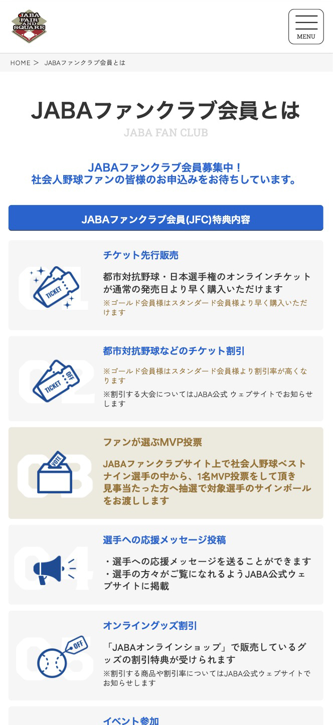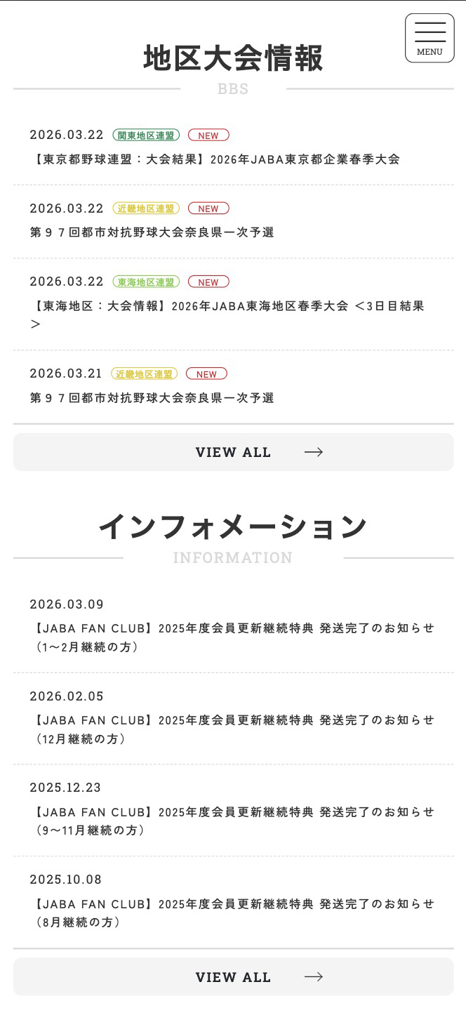 JABAファンクラブ 日本野球連盟公式サイト FANCLUB JABAファンクラブ OFFICIAL SITE 日本野球連盟公式サイト URL https://www.jaba.or.jp/ EC https://jaba-onlineshop.com/ FANCLUBOFFICIAL SITE BACK BACK TO INDEX NEXT お問い合わせCONTACT ファンクラブ、制作に関することならお気軽にご連絡ください。お見積もり依頼も可能です。 会社資料ダウンロードDOCUMENT 実績などをまとめた資料をPDFにてご用意しております。ご自由にダウンロードください。